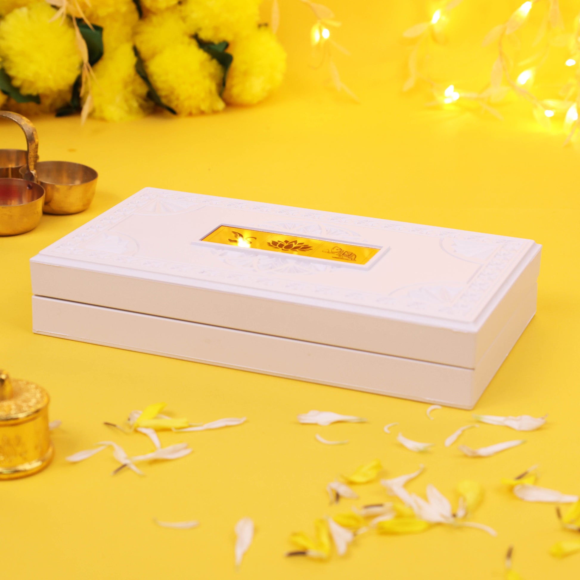 Bring prosperity, wisdom, and blessings into your home with this divine 3D Lakshmi Ganesh Saraswati Charan Paduka . Expertly designed with gold-plated detailing and fine embossed craftsmanship, this frame depicts Goddess Lakshmi, Lord Ganesha, and Goddess Saraswati — the holy trinity of wealth, intelligence, and learning. Each frame includes two gold coins and sacred charan paduka (footprints) placed in a luxurious white box lined with red velvet. Ideal for your puja room, home mandir, or office altar, this spiritual décor piece radiates purity, faith, and auspicious energy. Whether used as a Diwali gift, housewarming gift, wedding present, or simply as home temple decor, the Lakshmi Ganesh Saraswati Charan Paduka white box enhances every space with divine vibrations. Its compact design fits perfectly in modern homes while preserving traditional essence. A timeless devotional creation — this 3D Charan Paduka is not just a decorative piece but a sacred blessing that brings health, happiness, and harmony to your loved ones.