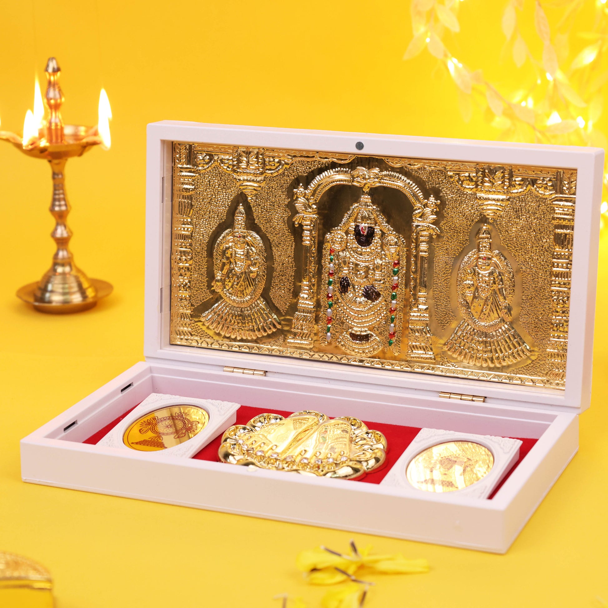 3D Charan Paduka with Tirupati Balaji Frame Gold Plated Temple Gift Box with inside Coin Set