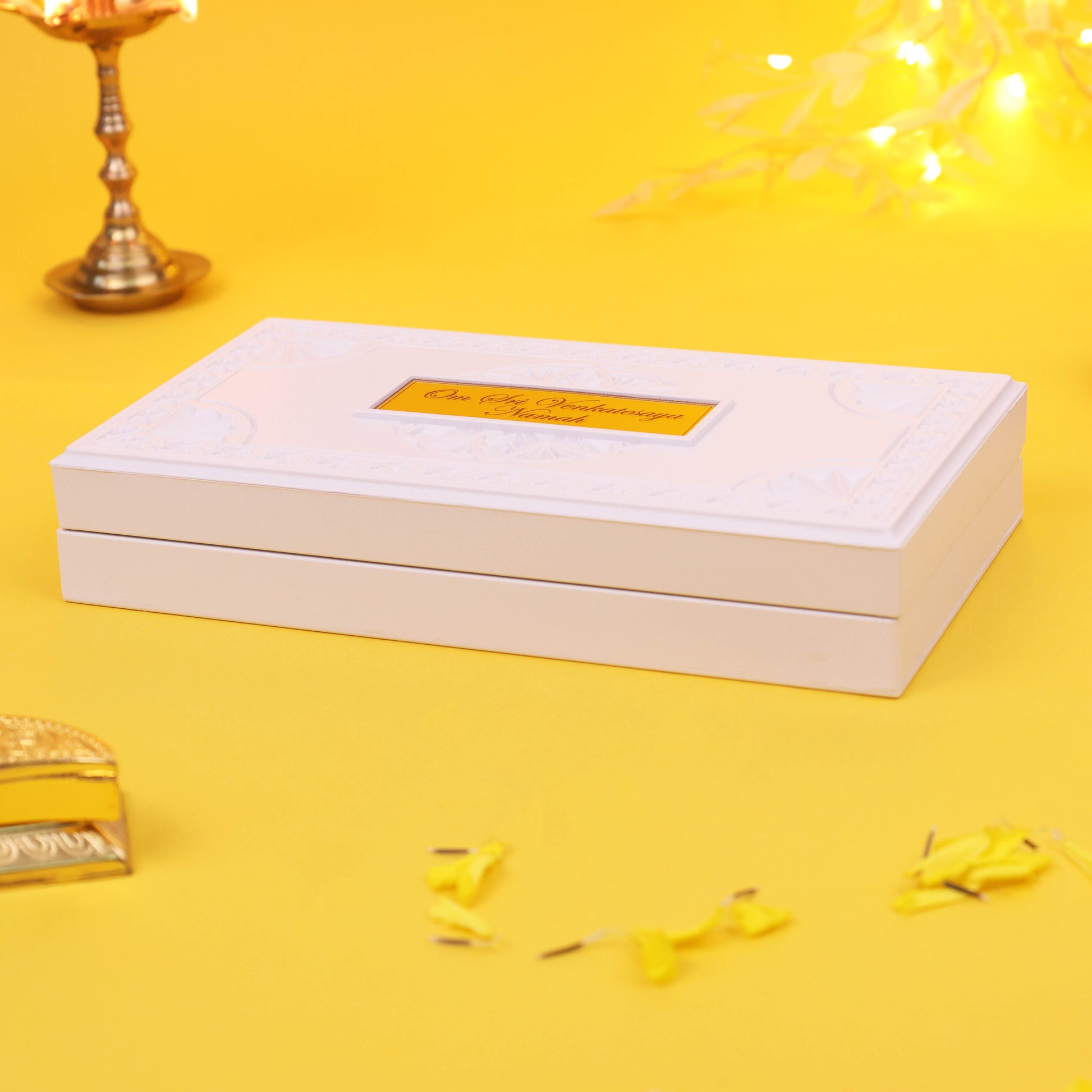- Gold Plated Charan Paduka with Coins – The charan paduka box includes beautifully detailed gold-plated footprints and embossed coins, symbolizing divine blessings and auspicious energy.