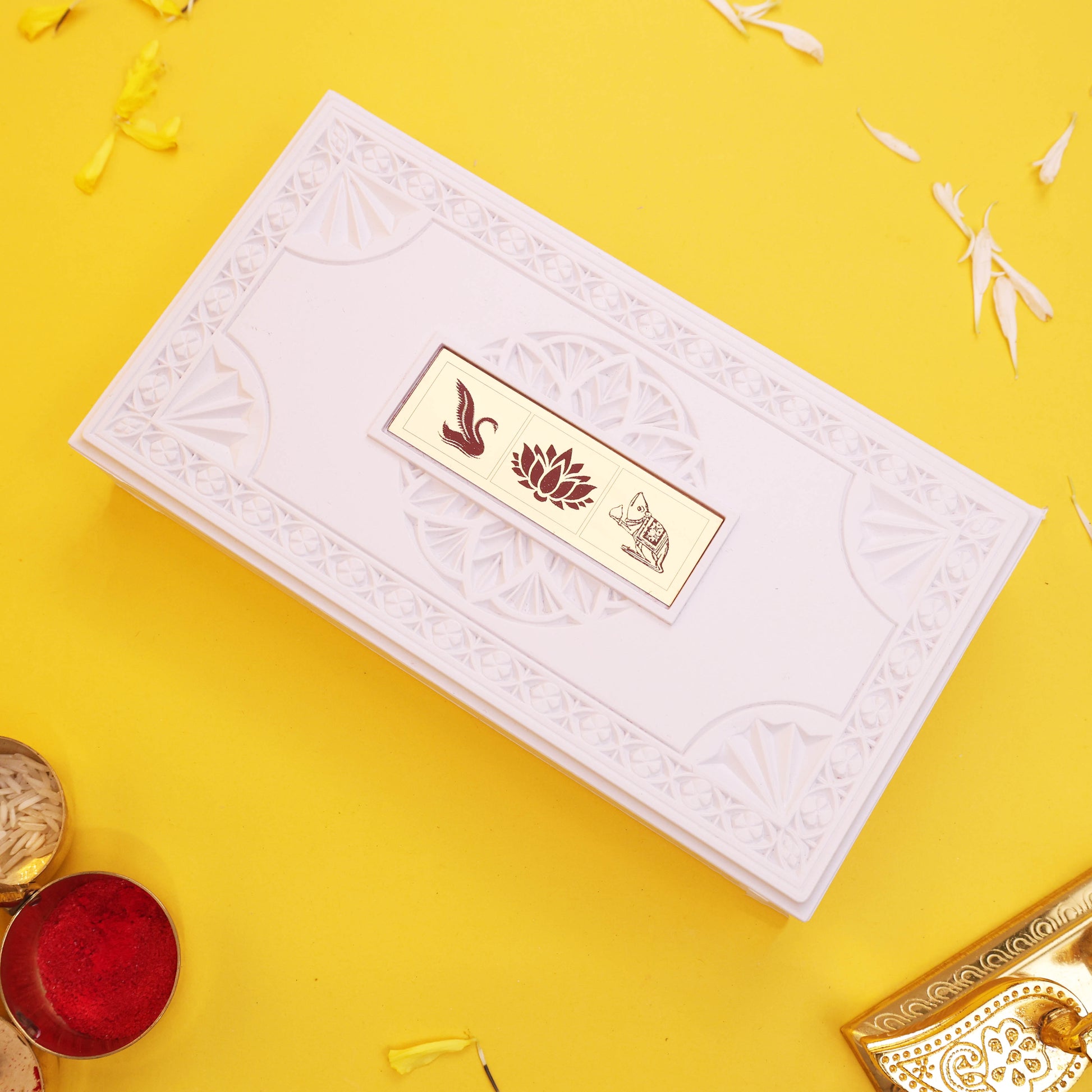 - Auspicious Charan Paduka Gift Box – Includes golden charan paduka, Shubh Labh coins, and a premium devotional box, designed to bring positive energy, blessings, and harmony into your home and workplace.
