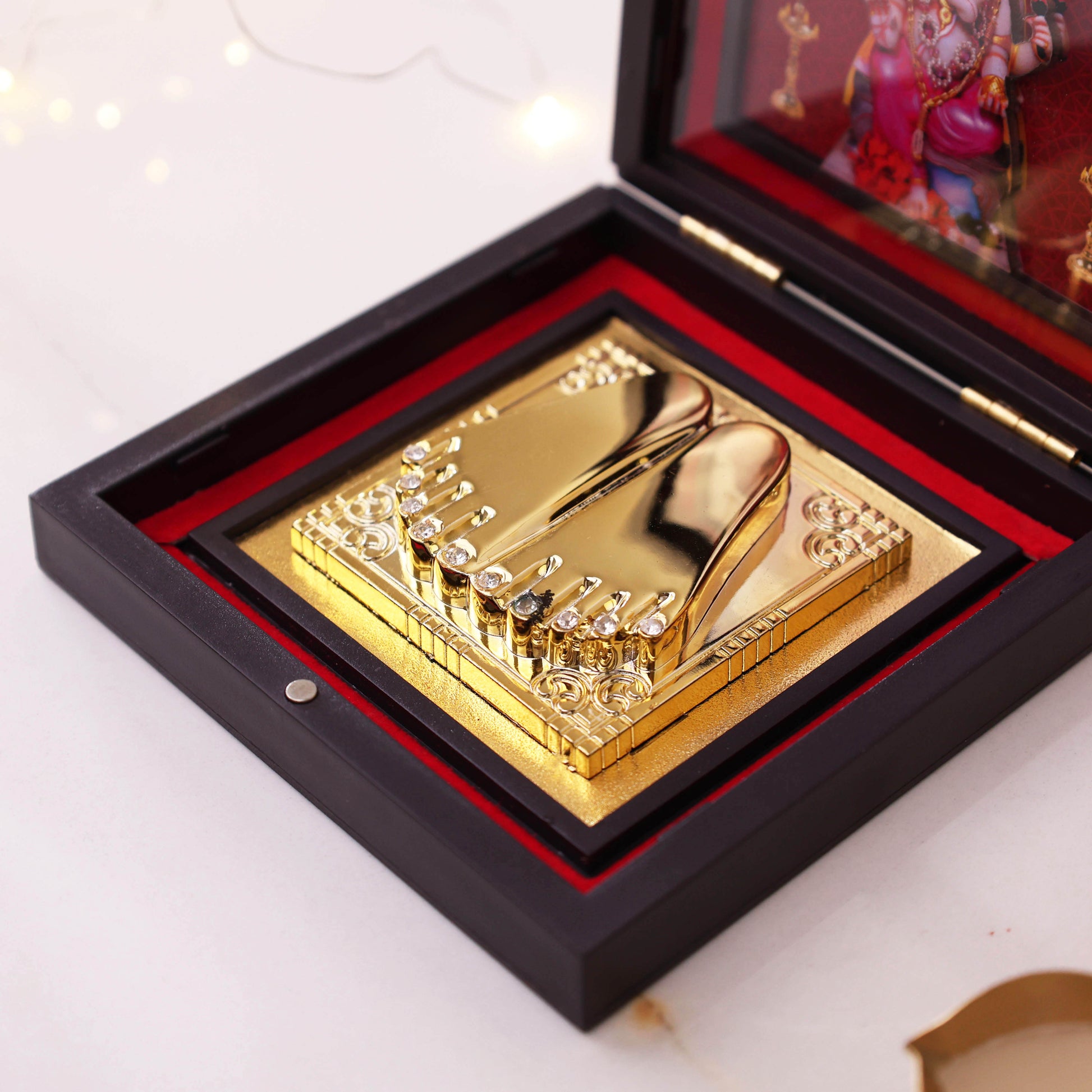 Designed with a premium gold finish, this charan paduka adds an elegant and devotional touch to your pooja room, home mandir, or workspace. It comes with a high-quality wooden box featuring a vibrant image of Lord Ganesha, making it an excellent option for both daily worship and gifting.
